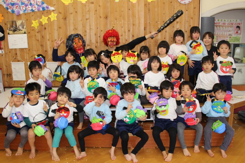 2017-02-03 節分まめまき 今日は節分ですね。日出やまとこども園でも、子どもたちの健康を祈ってみんなで豆まきをしました。各クラスで製作の発表をして、そのあとは2匹の鬼さんがやってきました。少し怖がっていた子どもたちでしたが一生懸命に豆まきをして、鬼を追い払いましたよ(^^)/