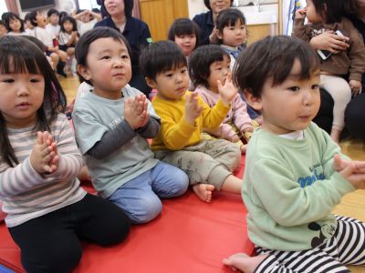 2023-04-13 4月誕生会 今日は、入園・進級して初めての誕生会でした。みんなで『ちょうちょ』や『チューリップ』の歌を歌ったり、大型絵本を見て楽しみました♪4月生まれのお友だち!おめでとう(^^)/